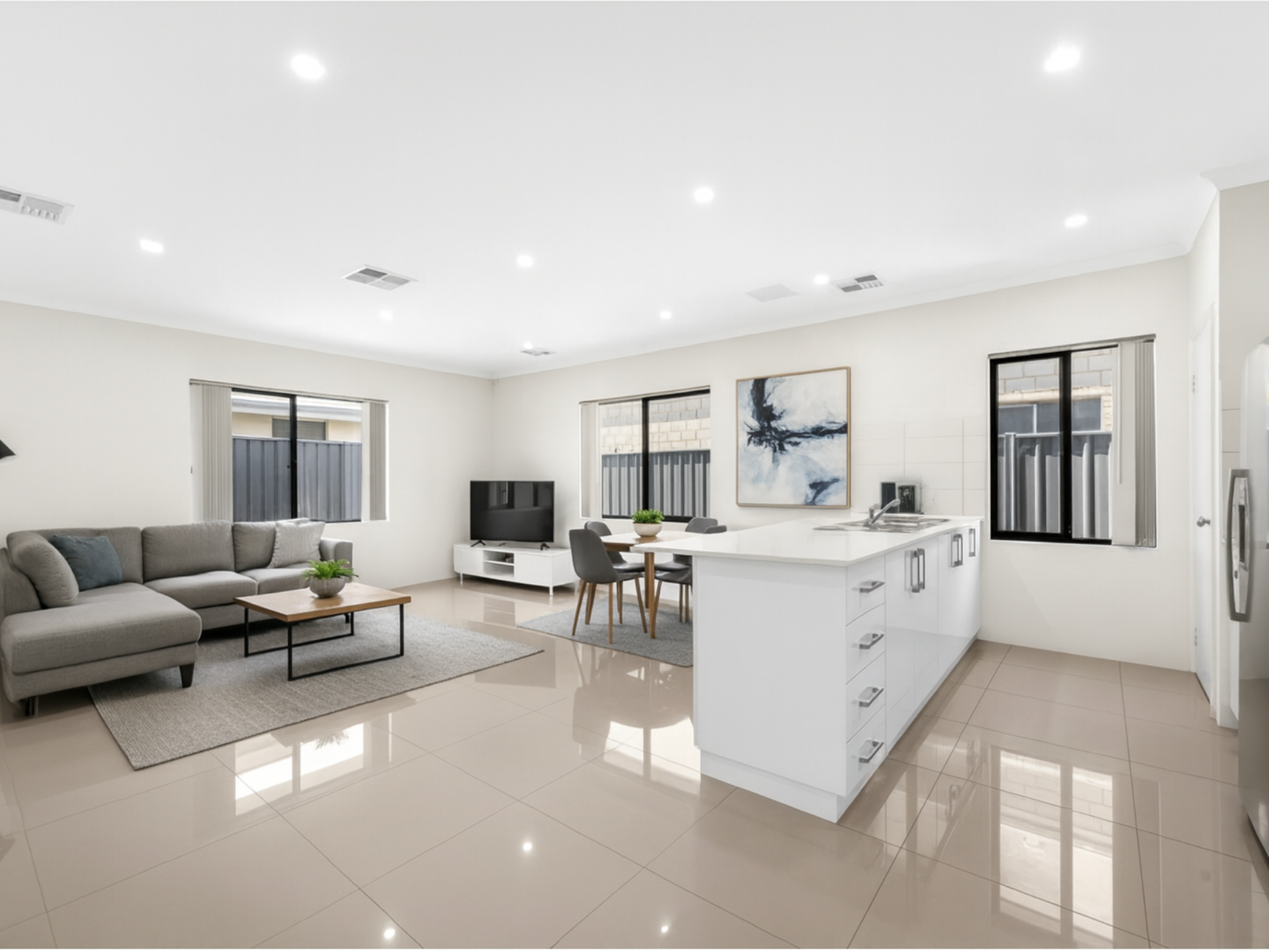 - Light-filled open-plan kitchen, living, and dining area with stone benchtops and plenty of storage