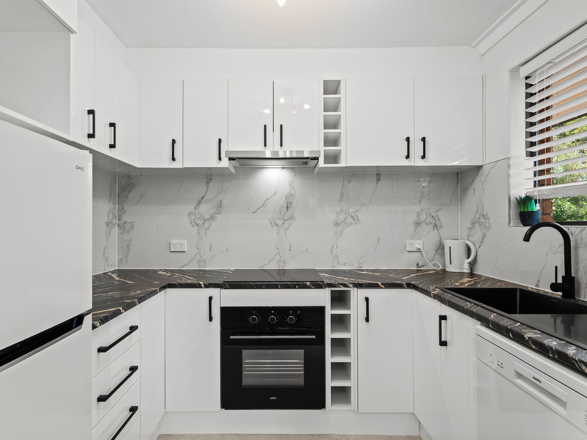 - A sleek, modern kitchen fully equipped with brand-new appliances, including a dishwasher, fridge, electric cooktop, and oven-designed for effortless cooking and entertaining.
