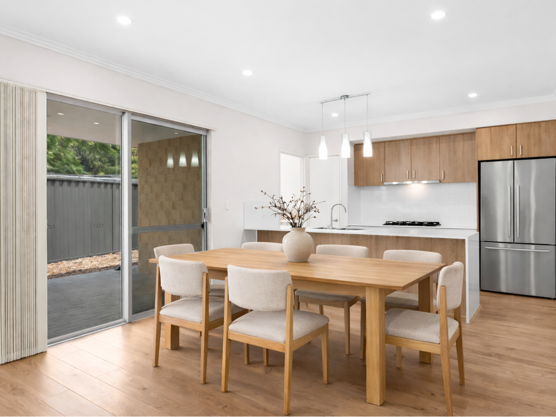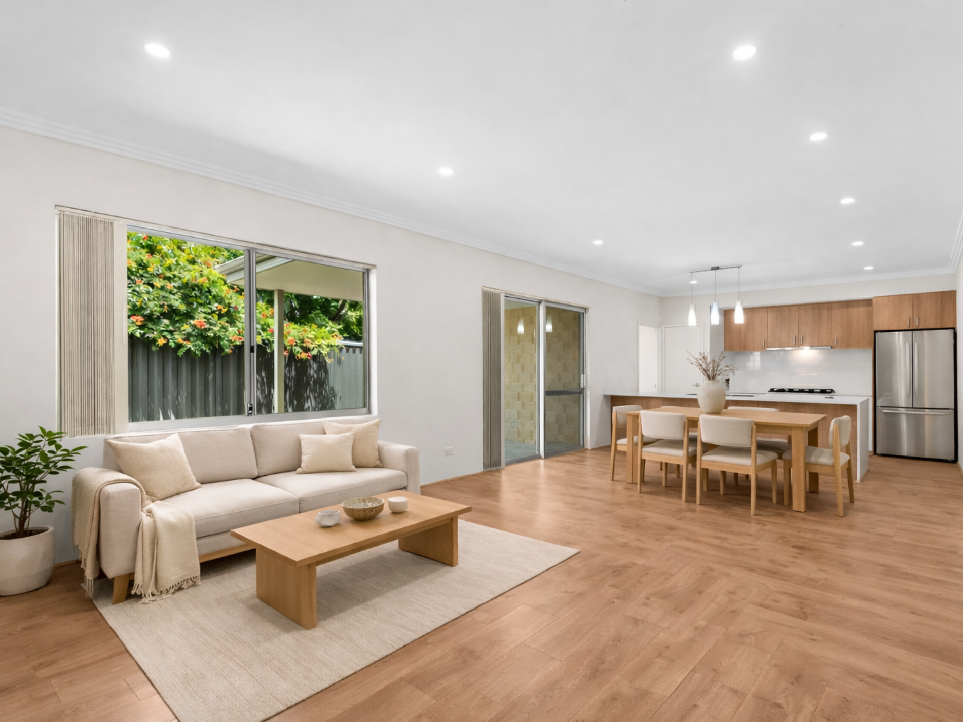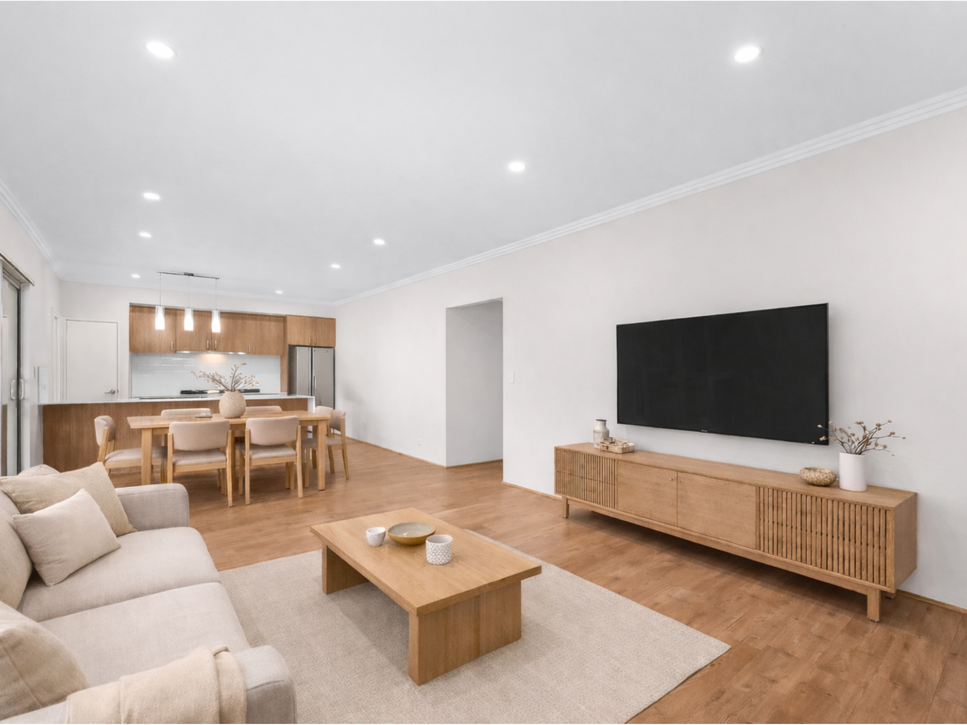- Modern open plan kitchen, dining, and living area filled with natural light during the day